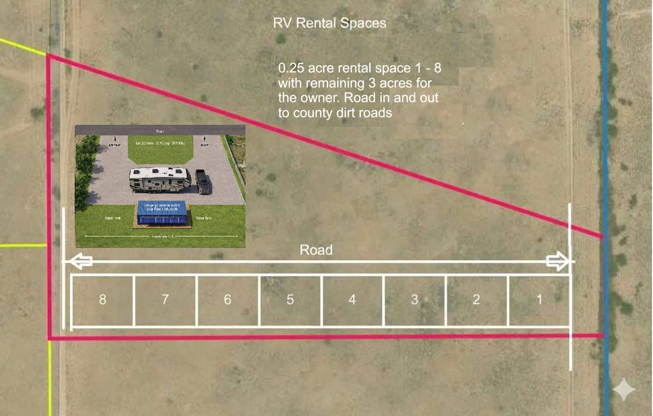 You don’t have to live in NM to startup and run this business, if you are good at managing a business and hire the right people. You don’t have to live on the property and if you don’t live on the property, it’s a business which qualifies for business loans and financing, with all the write offs as well. Fence off this 5 acres and begin creating your dreams! Go vacation at your favorite spot at your business location. The red lines are the property lines and the white lines are the dirt roads you create for easy access to all areas of your property. This is one business with income that will not be replaced by AI or Robots any time soon. If you are looking for a side gig or a full time business, this is a great place to start! The middle of the property could be used for some farming. The far end of this property away from the main house could be the commercial end where you service RV’s doing upgrades, solar, batteries, and repairs. As mentioned this is a great business model just waiting to happen. Here is where you can find used RV’s at very good deals, Facebook/RV’s or Camping World